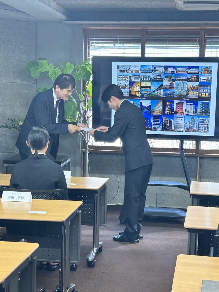 式の中では、入塩社長から内定証書の授与と、内定者への祝辞が贈られました。